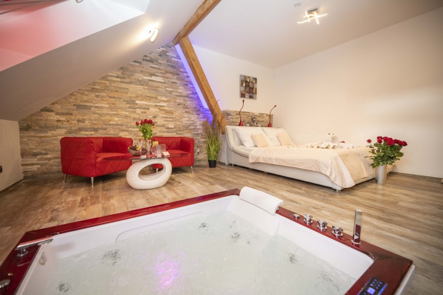 Čeká na Vás krásná prosklená finská sauna, vířivá vana vsazená v zemi, ze které přímo dosáhnete na minibar, luxusní postel k odpočinku a kamenná koupelna.
